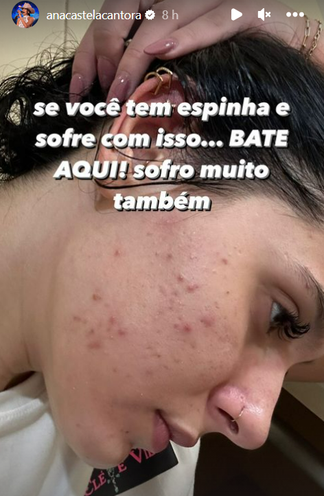 A cantora sertaneja Ana Castela desabafou nas redes sociais neste final de semana que sofre com acnes no rosto. Exibindo uma foto da pele acneica na região da bochecha e maxilar, a estrela de 19 anos revelou: "Se você tem espinha e sofre com isso, bate aqui! Sofro muito também".