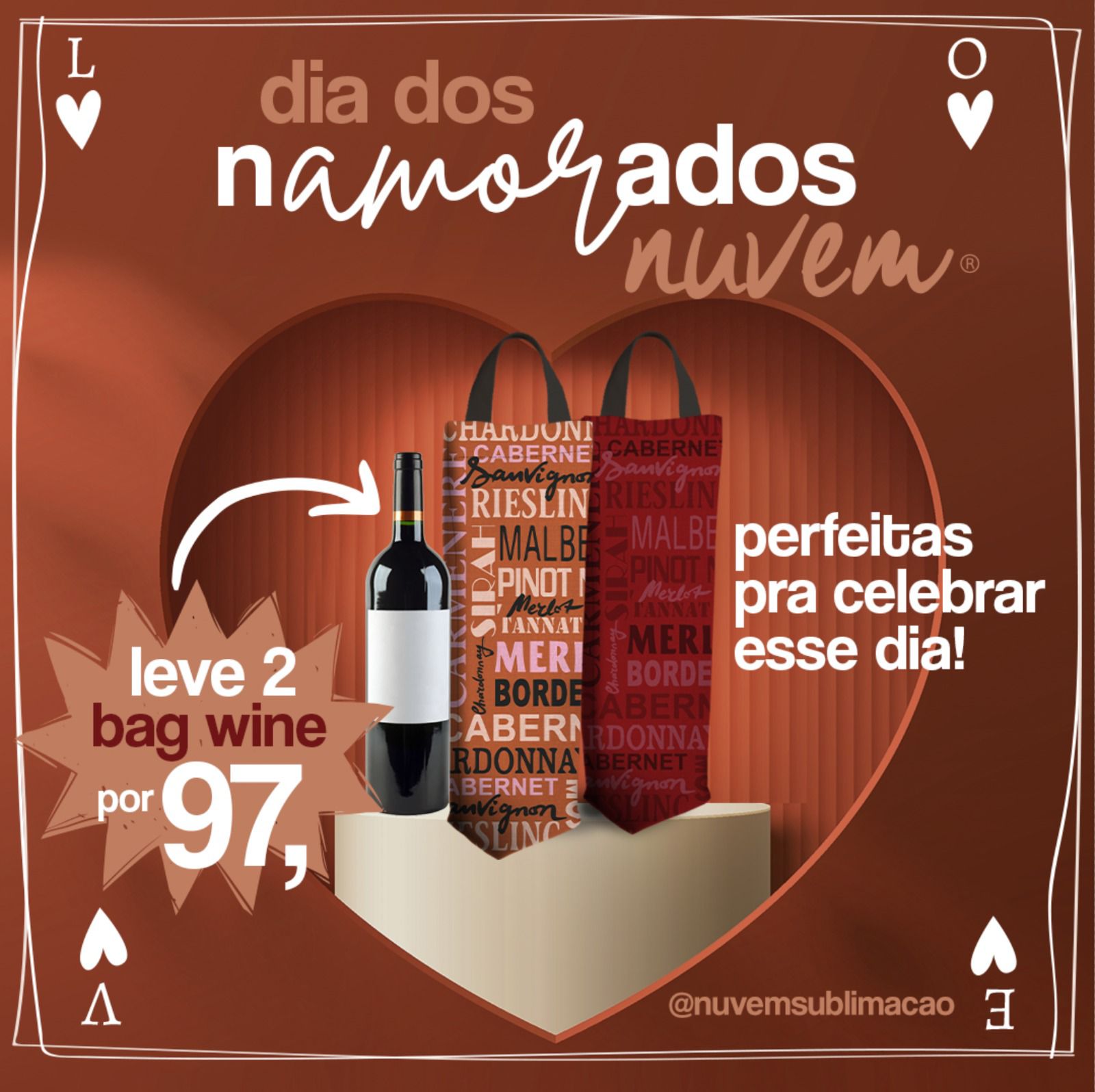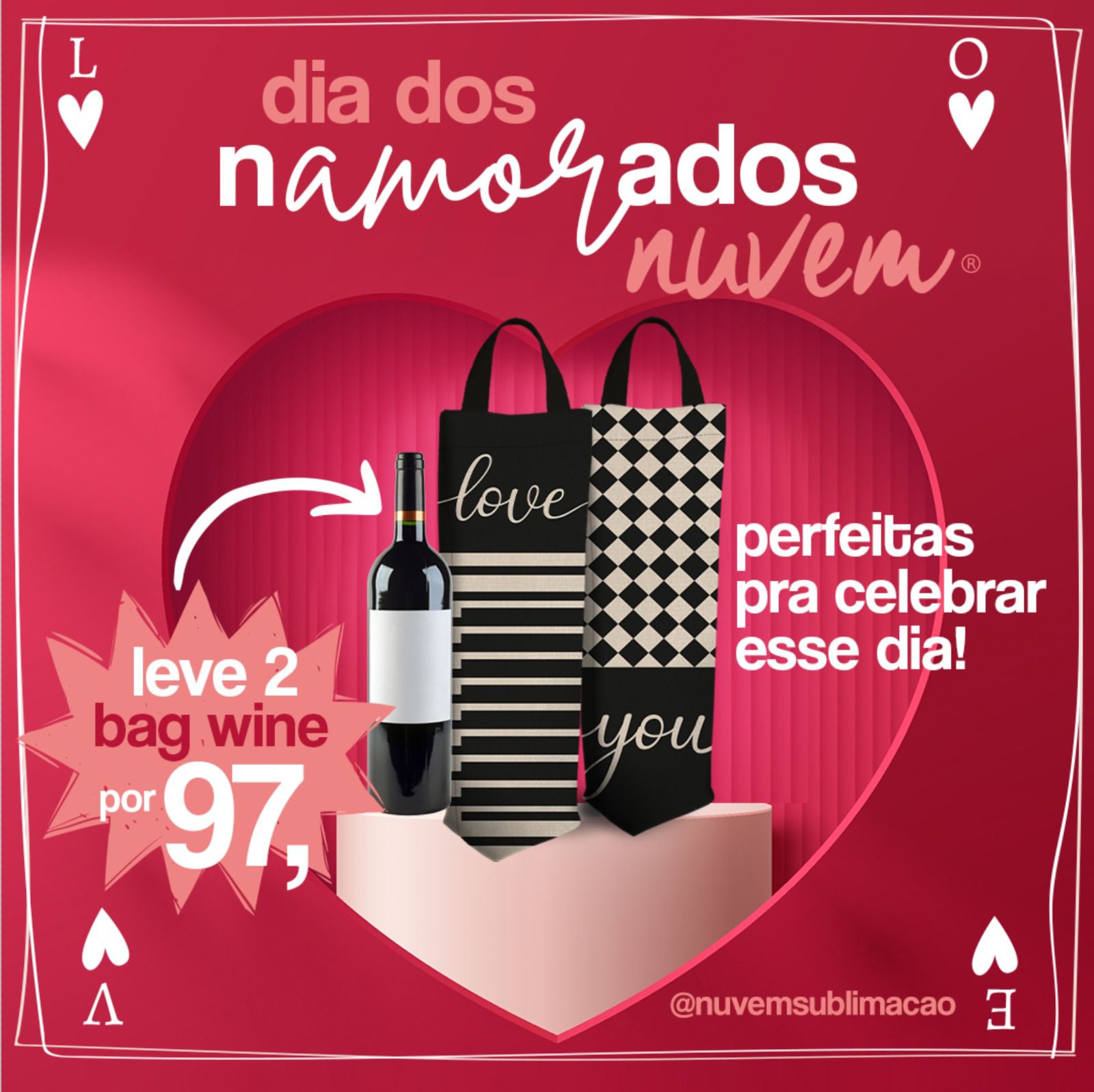 Com design exclusivo, prática, projetada para reduzir impactos e manter a temperatura ideal da bebida, a Nuvem Sublimação está vendendo duas bags wine por R$ 97,00.